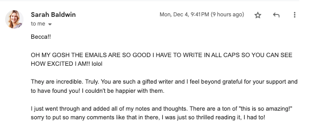 “Becca cares deeply and puts so much of her time and heart into the work. Not only that, but our open rates and click rates went up because of our work with her. Our last launch NYNS had higher click rates and open rates because of Becca’s help!”