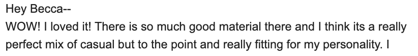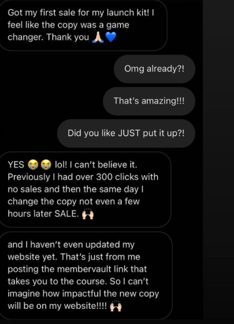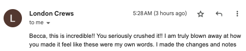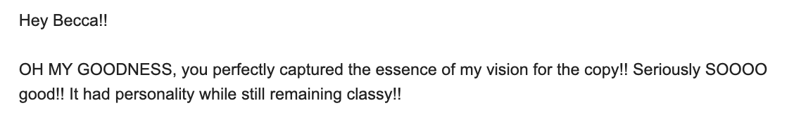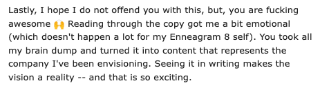 “The VIP day is SO worth it! You were able to hear my values, wants, desires and then turn it into copy I can't wait to use. The tone of voice is perfect, and I've already had other friends and family review it to make sure it sounds like me, and they all agree that the copy aligns with everything I wanted but couldn't communicate myself.”