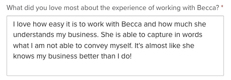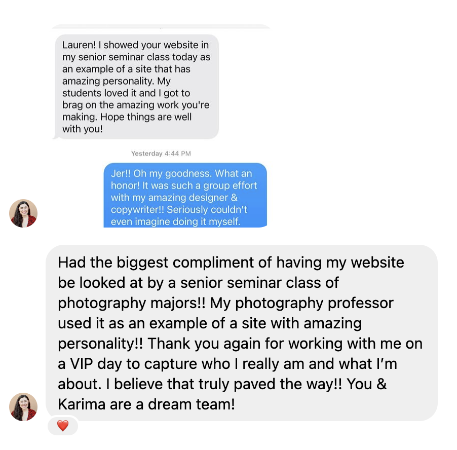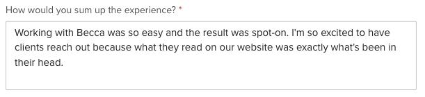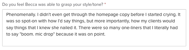 “I personally don't enjoy the writing process, so for me this was a HUGE load taken off my back, especially with the daunting task of re-doing a new website! I knew I didn't need to worry about this one thing (copy) and that really made this undertaking much easier!”