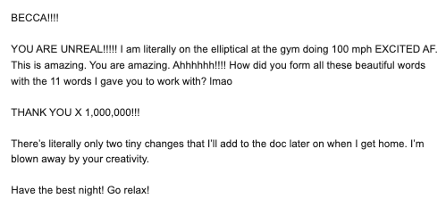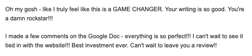"I’m amazed at how much she wrote for me. I didn’t realize it was humanly possible to complete QUALITY copy in one day. This experience was AMAZING!”