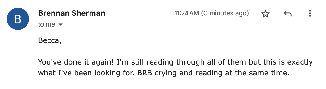 Why unlimited? Because you’re spending good money on new copy for your business, and I want you to love it so much you endlessly yap about it, tag me in your IG posts, tell your friends, tell the cashier at your grocery store, and say things like this to me: “My copy is exactly how I wanted it to be. It showcases my services and I feel relieved and really proud of what's on my website. I can't wait to get more people to see it!”
