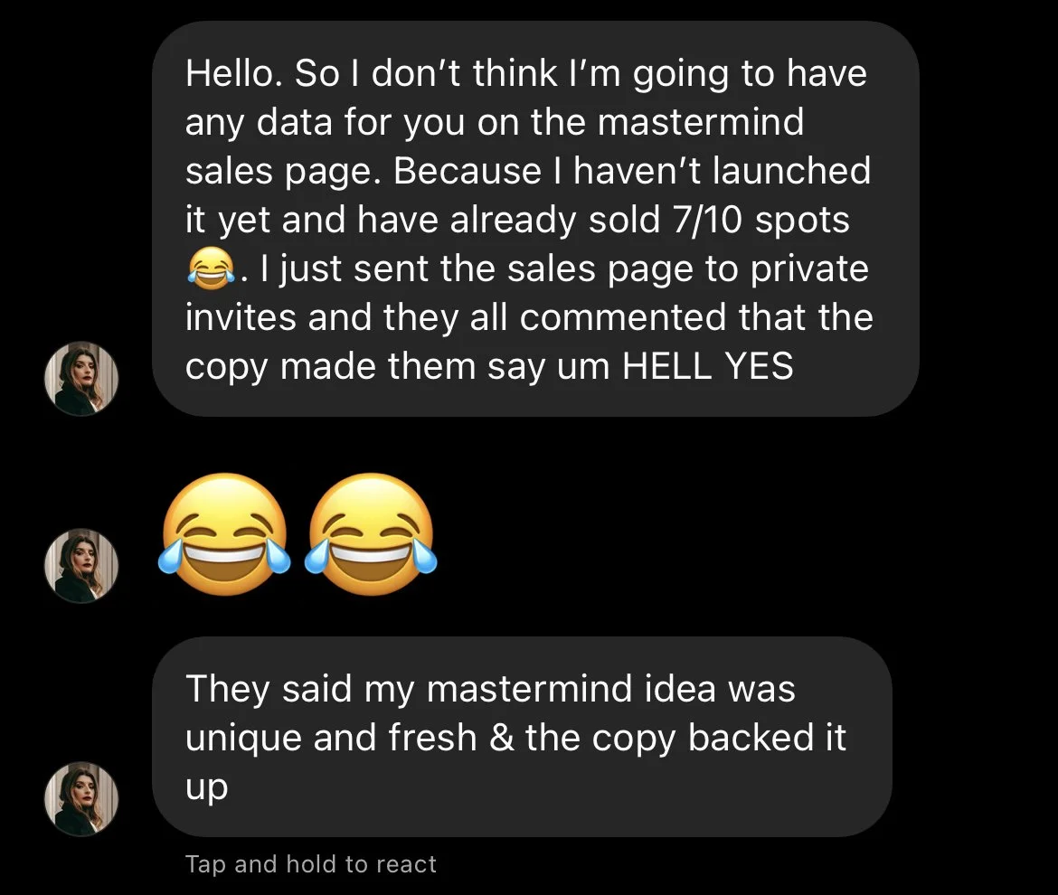 I’ve done this hundreds of times, across dozens of industries, offers, and stages of business. The work is intentional, the process is simple, and you’ll have copy you can actually use at the end of the day.