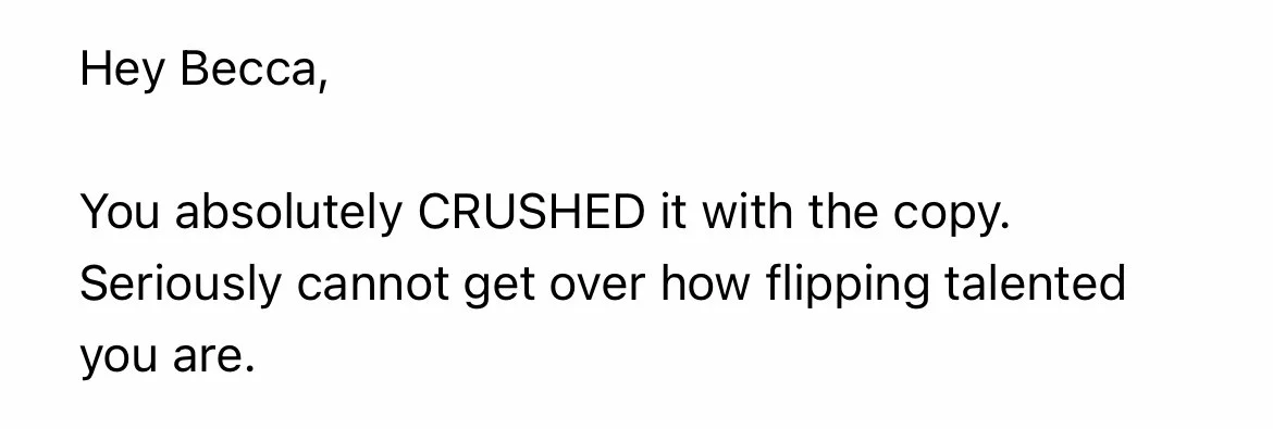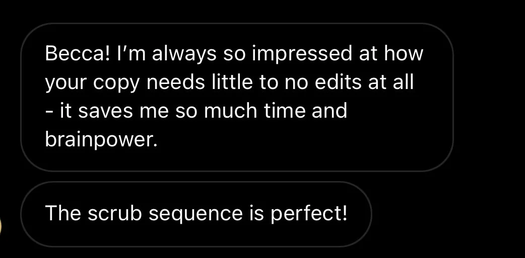 Clients often tell me this outside perspective is what turns messy brain dumps into copy that feels like I’ve finally articulated what they’ve been trying to say for months (sometimes years).